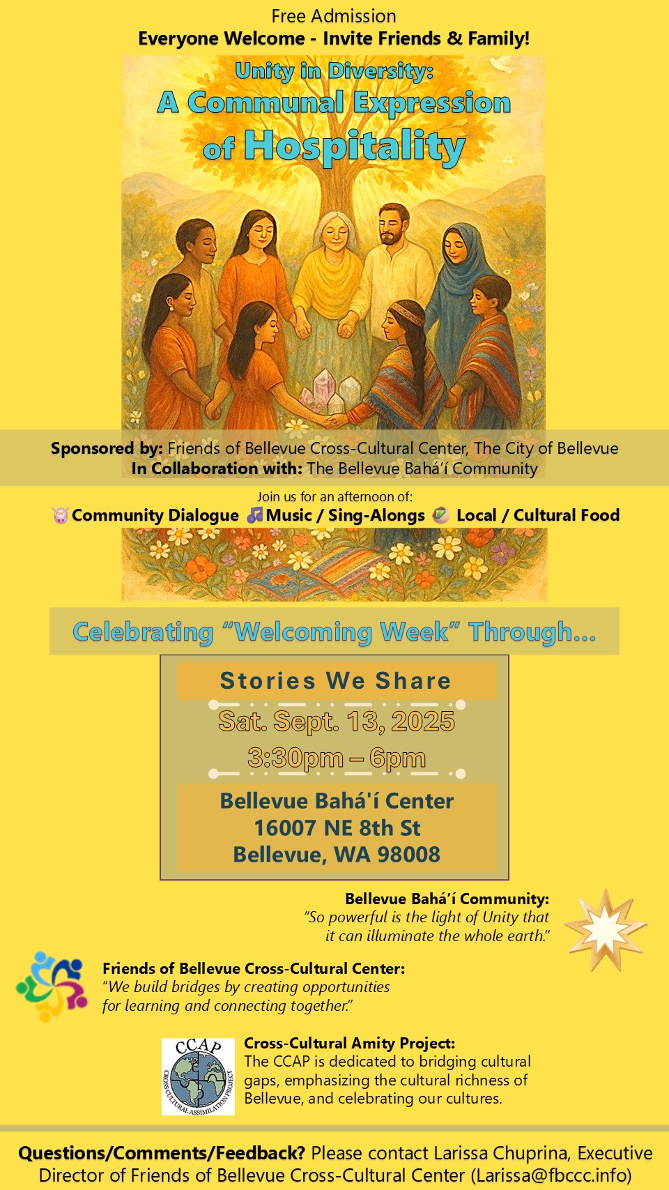 This Welcoming Week event is hosted by Friends of Bellevue Cross-Cultural Center, in collaboration with the Eastside Baha’i Community and supported by the City of Bellevue. Whether you’re new to the community or have called it home for years, this is a space to connect, reflect, and celebrate the beauty of welcoming one another.
